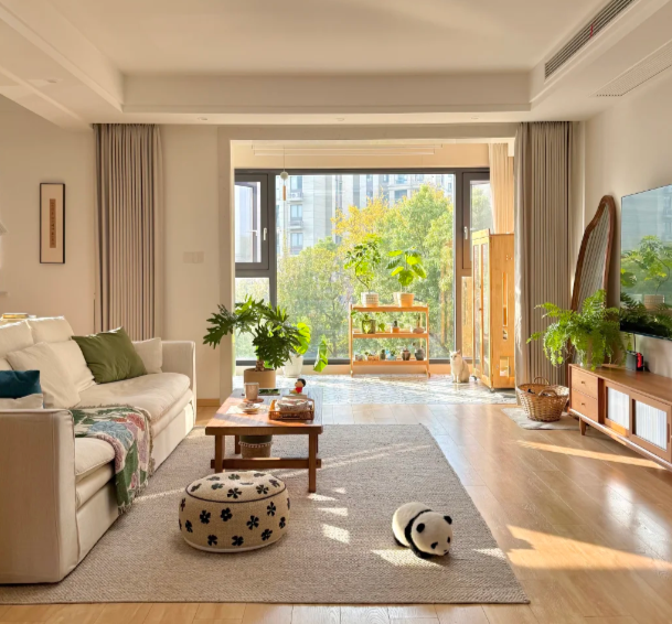 想象一下午后的客厅,阳光直射进来,在地板上投下生硬的光斑。这时,一层浅米色的亚麻窗帘就能改变一切。亚麻纤维天然的肌理与轻微透光性,像给阳光蒙上了一层柔光滤镜,让光线变得温润、蓬松,室内的空气仿佛也慢了下来。这种对光线的处理,就像给空间“定调”,它奠定了整个聚会场景的基调:松弛、自然、不刻意。